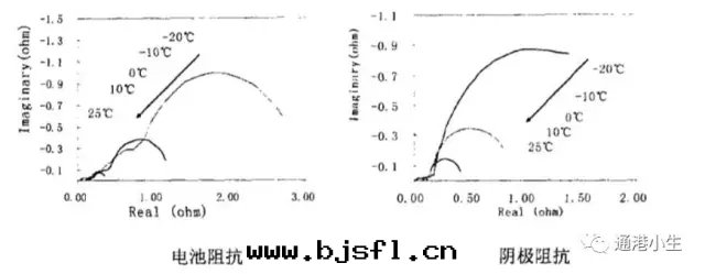 電(diàn)池阻抗主(zhǔ)要(yào)體(tǐ)現(xiàn)为(wèi)電(diàn)化(huà)學(xué)反(fǎn)應(yìng)阻抗,而(ér)歐姆阻抗相对(duì)較小。由(yóu)下(xià)图(tú)可(kě)知。随着温(wēn)度(dù)的(de)下(xià)降,電(diàn)池阻抗逐渐上(shàng)升(shēng),且(qiě)下(xià)降至(zhì)0°C以(yǐ)後(hòu),阻抗速度(dù)增大(dà),陰极阻抗呈類(lèi)似的(de)趨势,从數值上(shàng)来(lái)看(kàn),電(diàn)池的(de)阻抗主(zhǔ)要(yào)来(lái)源于陰极阻抗的(de)貢献。