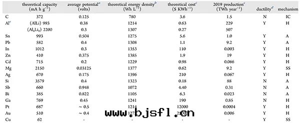 表1. 锂合金(jīn)負极的(de)理(lǐ)論性(xìng)能(néng)