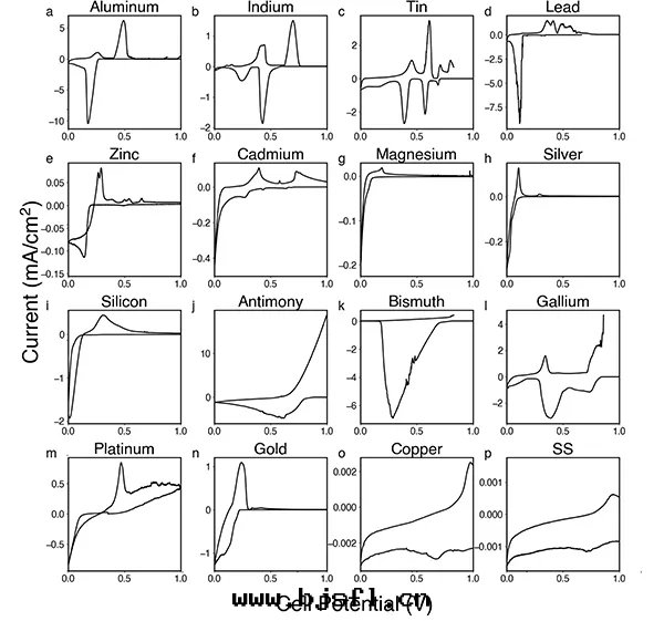 为(wèi)了理(lǐ)解(jiě)準平衡态下(xià)各(gè)元(yuán)素的(de)電(diàn)化(huà)學(xué)反(fǎn)應(yìng)路(lù)徑,以(yǐ)各(gè)元(yuán)素制備的(de)箔電(diàn)极與(yǔ)Li負极組成(chéng)的(de)半電(diàn)池循环(huán)伏安(ān)測試結果(guǒ)如(rú)图(tú)1所(suǒ)示。其(qí)中(zhōng),Al和(hé)In材料可(kě)以(yǐ)與(yǔ)Li反(fǎn)應(yìng)形成(chéng)可(kě)逆的(de)中(zhōng)間(jiān)相(AlLi和(hé)InAl),循环(huán)伏安(ān)曲(qū)線(xiàn)展(zhǎn)現(xiàn)出(chū)良好(hǎo)的(de)可(kě)逆循环(huán)性(xìng),但这(zhè)也(yě)限制了其(qí)富锂相的(de)形成(chéng)。Ti和(hé)Pb則会(huì)經(jīng)曆一(yī)系(xì)列中(zhōng)間(jiān)相最(zuì)終(zhōng)完成(chéng)與(yǔ)Li的(de)合金(jīn)化(huà)反(fǎn)應(yìng)。Zn箔在(zài)0.18 V處(chù)的(de)還(huán)原峰(fēng)表明(míng)其(qí)在(zài)該電(diàn)势下(xià)完成(chéng)了锂化(huà)反(fǎn)應(yìng),反(fǎn)向扫描的(de)遲滞現(xiàn)象(xiàng)意味着Zn箔锂化(huà)後(hòu),Li的(de)傳輸得到(dào)了改善。Cd,Mg和(hé)Ag箔直(zhí)至(zhì)扫描末(mò)端才出(chū)現(xiàn)還(huán)原峰(fēng),表明(míng)这(zhè)些(xiē)材料難以(yǐ)與(yǔ)Li完全(quán)反(fǎn)應(yìng),儲锂效率低(dī)。Si,Bi,Sb和(hé)Ga晶片(piàn)相較于金(jīn)屬箔而(ér)言厚度(dù)較大(dà),但依旧(jiù)展(zhǎn)現(xiàn)出(chū)优秀的(de)儲锂容量(liàng),其(qí)中(zhōng)Bi和(hé)Sb材料可(kě)逆性(xìng)极差,導致(zhì)去(qù)合金(jīn)化(huà)的(de)氧化(huà)过(guò)程難以(yǐ)完成(chéng)。Au和(hé)Pt在(zài)電(diàn)势低(dī)于0.25 V後(hòu)可(kě)以(yǐ)完成(chéng)與(yǔ)Li的(de)合金(jīn)化(huà)反(fǎn)應(yìng),但在(zài)去(qù)合金(jīn)化(huà)結束(shù)後(hòu),Pt会(huì)繼續催化(huà)電(diàn)极發(fà)生(shēng)不可(kě)逆的(de)副反(fǎn)應(yìng)。