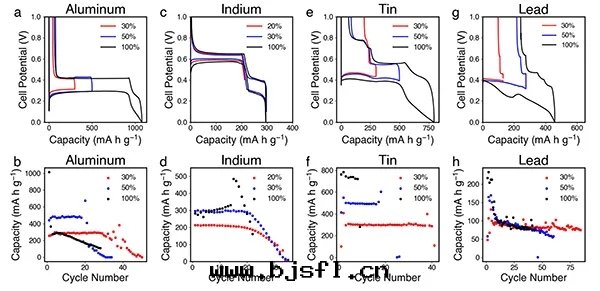 不同(tóng)利用率下(xià)的(de)循环(huán)性(xìng)能(néng)測試:(b) Al;(d) In;(f) Sn;(h) Pb。