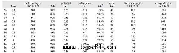 金(jīn)屬箔電(diàn)极在(zài)不同(tóng)利用率下(xià)的(de)长(cháng)循环(huán)測試如(rú)图(tú)3所(suǒ)示。測試过(guò)程中(zhōng),依據(jù)不同(tóng)的(de)利用率将還(huán)原電(diàn)位(wèi)設置至(zhì)相應(yìng)值对(duì)金(jīn)屬箔进行放(fàng)電(diàn)測試,其(qí)氧化(huà)電(diàn)位(wèi)統一(yī)設置为(wèi)1.0 V vs Li/Li+。如(rú)图(tú)3a及(jí)表3所(suǒ)示,鋁(lǚ)金(jīn)屬箔負极在(zài)0.3,0.5,1.0的(de)SOC下(xià)有着86%,88%,93%的(de)首次庫倫效率,但接近(jìn)0 V的(de)電(diàn)势会(huì)形成(chéng)大(dà)量(liàng)不可(kě)逆的(de)锂鋁(lǚ)合金(jīn),使得第(dì)二(èr)圈比容量(liàng)僅为(wèi)34%並(bìng)在(zài)之(zhī)後(hòu)迅速衰減(图(tú)3b)。图(tú)3c为(wèi)In金(jīn)屬箔的(de)首次充放(fàng)電(diàn)曲(qū)線(xiàn),当极片(piàn)利用率由(yóu)20%提高(gāo)至(zhì)100%时(shí),In金(jīn)屬箔都展(zhǎn)示出(chū)极其(qí)优异(yì)的(de)首次庫倫效率(98-99%),但在(zài)20圈循环(huán)後(hòu)会(huì)發(fà)生(shēng)容量(liàng)的(de)迅速衰減。对(duì)于Sn金(jīn)屬箔而(ér)言,其(qí)首次庫倫效率随着SOC的(de)提高(gāo)而(ér)提升(shēng),並(bìng)在(zài)第(dì)二(èr)圈循环(huán)中(zhōng)表現(xiàn)出(chū)高(gāo)于100%的(de)庫倫效率,具體(tǐ)的(de)脫嵌锂機(jī)制将会(huì)在(zài)之(zhī)後(hòu)的(de)研究中(zhōng)詳细(xì)描述。由(yóu)图(tú)3f可(kě)知限制Sn金(jīn)屬箔的(de)SOC範圍同(tóng)樣(yàng)可(kě)以(yǐ)得到(dào)更(gèng)好(hǎo)的(de)循环(huán)穩定(dìng)性(xìng)。相較于前(qián)三(sān)者(zhě),Pb金(jīn)屬箔的(de)首次庫倫效率在(zài)各(gè)SOC下(xià)都不容乐(lè)觀,並(bìng)在(zài)100 mA h g−1的(de)電(diàn)流密度(dù)下(xià)發(fà)生(shēng)較严重(zhòng)的(de)容量(liàng)衰減,意味着Pb金(jīn)屬箔表明(míng)形成(chéng)的(de)SEI可(kě)能(néng)相对(duì)不穩定(dìng)。