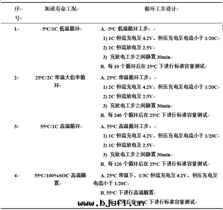 據(jù)此(cǐ),設計(jì)了如(rú)表1所(suǒ)示的(de)4種(zhǒng)加速壽命測試試验,包(bāo)括低(dī)温(wēn)循环(huán)、常温(wēn)大(dà)倍率循环(huán)、高(gāo)温(wēn)循环(huán)和(hé)高(gāo)温(wēn)擱置4種(zhǒng)衰減工況,誘發(fà)上(shàng)述衰減副反(fǎn)應(yìng),探究不同(tóng)衰減副反(fǎn)應(yìng)对(duì)電(diàn)池全(quán)生(shēng)命周期热(rè)失控特(tè)性(xìng)演变的(de)影響规律。