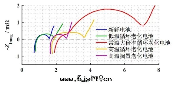 图(tú)3 不同(tóng)老(lǎo)化(huà)路(lù)徑下(xià)衰減至(zhì)80%SOH的(de)電(diàn)池EIS測試結果(guǒ)