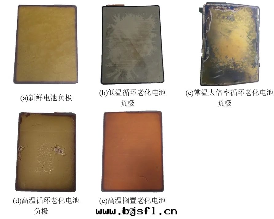 图(tú)4 不同(tóng)老(lǎo)化(huà)路(lù)徑下(xià)衰減至(zhì)80%SOH的(de)電(diàn)池負极极片(piàn)拆解(jiě)外(wài)觀图(tú)片(piàn)