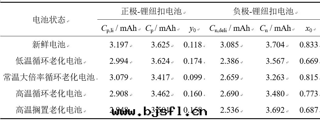 表2为(wèi)老(lǎo)化(huà)電(diàn)池紐扣(kòu)電(diàn)池測試結果(guǒ)。正(zhèng)极-锂紐扣(kòu)電(diàn)池測試結果(guǒ)中(zhōng),Cp,li为(wèi)正(zhèng)极首次嵌锂容量(liàng),而(ér)Cp代(dài)表正(zhèng)极可(kě)用脫嵌锂容量(liàng),y0 = 1 - Cp,li/Cp 用于反(fǎn)映100%SOC下(xià)正(zhèng)极的(de)锂含量(liàng)。同(tóng)樣(yàng)地(dì),Cn,deli为(wèi)負极首次脫锂容量(liàng),而(ér)Cn代(dài)表負极可(kě)用脫嵌锂容量(liàng),x0 = Cn,deli/Cn用于反(fǎn)映100%SOC下(xià)負极的(de)锂含量(liàng)。根據(jù)電(diàn)池容量(liàng)衰減的(de)双(shuāng)水(shuǐ)箱(xiāng)模型,Cp和(hé)Cn的(de)下(xià)降表明(míng)電(diàn)池內(nèi)部(bù)出(chū)現(xiàn)了正(zhèng)負极活性(xìng)物(wù)質(zhì)损失,而(ér)y0和(hé)x0的(de)变化(huà)可(kě)以(yǐ)用来(lái)反(fǎn)映電(diàn)池內(nèi)部(bù)可(kě)用锂离子的(de)损失情(qíng)況。
