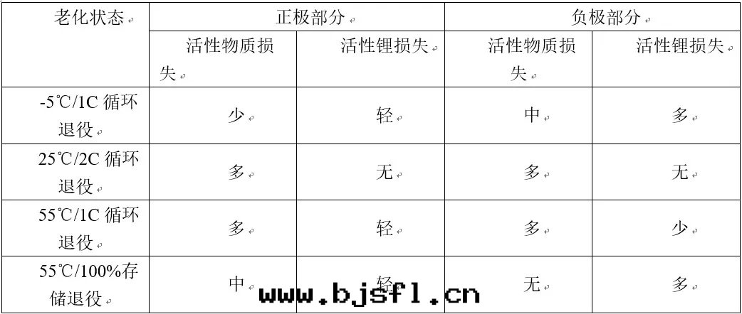 總(zǒng)結上(shàng)述分(fēn)析,4種(zhǒng)不同(tóng)老(lǎo)化(huà)工況下(xià)電(diàn)池的(de)衰減機(jī)理(lǐ)分(fēn)别如(rú)下(xià):