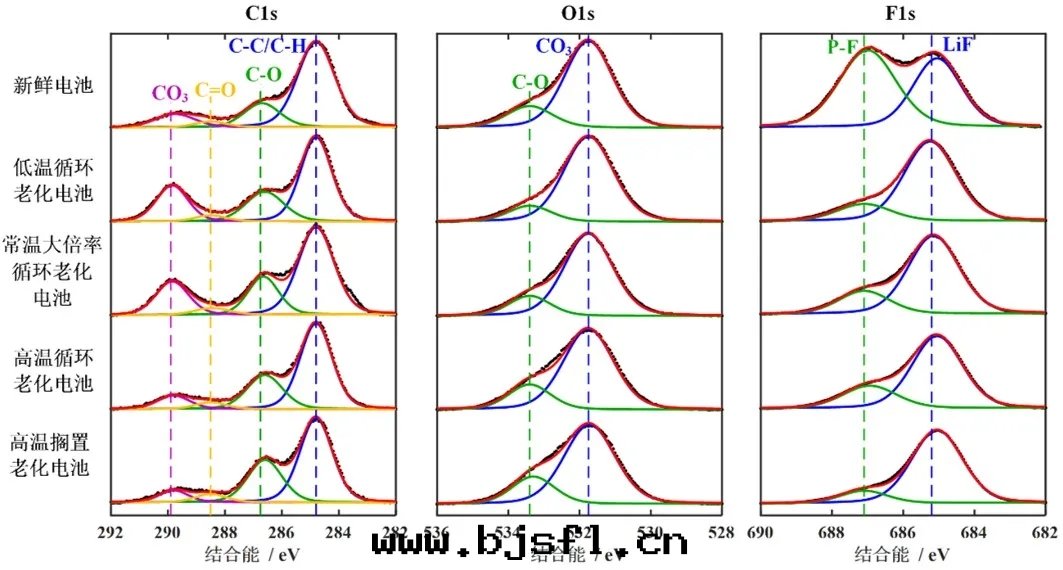 进一(yī)步地(dì),对(duì)正(zhèng)极材料进行XPS測試,分(fēn)析其(qí)表面(miàn)成(chéng)分(fēn),測試結果(guǒ)如(rú)图(tú)6所(suǒ)示。对(duì)于低(dī)温(wēn)循环(huán)老(lǎo)化(huà)電(diàn)池,正(zhèng)极表面(miàn)Li2CO3等成(chéng)分(fēn)的(de)含量(liàng)增加,LiF含量(liàng)減少(shǎo)。对(duì)于常温(wēn)大(dà)倍率循环(huán)老(lǎo)化(huà)和(hé)高(gāo)温(wēn)循环(huán)老(lǎo)化(huà)的(de)電(diàn)池,老(lǎo)化(huà)電(diàn)池正(zhèng)极表面(miàn)CEI的(de)主(zhǔ)要(yào)成(chéng)分(fēn)为(wèi)Li2CO3,ROCO2Li以(yǐ)及(jí)R-CH2-O-CO2Li等。而(ér)高(gāo)温(wēn)擱置老(lǎo)化(huà)電(diàn)池的(de)正(zhèng)极CEI膜主(zhǔ)要(yào)成(chéng)分(fēn)为(wèi)LiF。