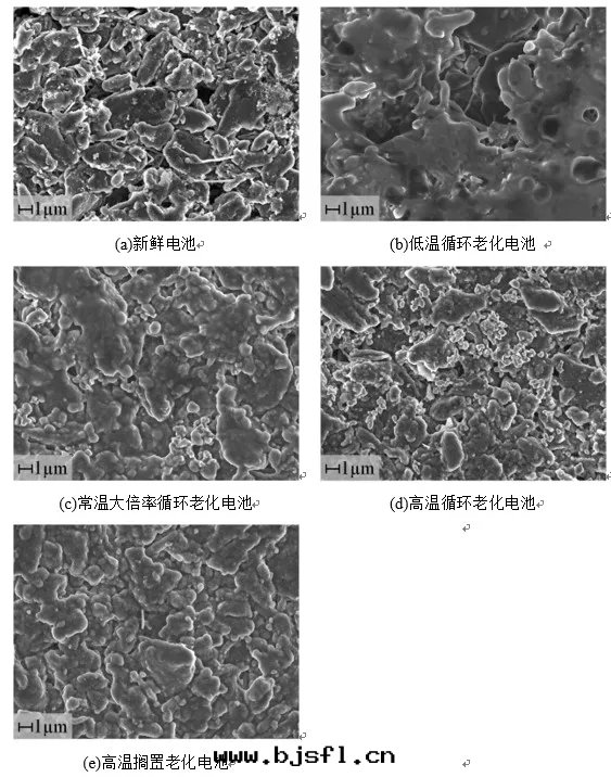 图(tú)5为(wèi)不同(tóng)衰減工況下(xià)的(de)老(lǎo)化(huà)電(diàn)池的(de)正(zhèng)极材料與(yǔ)新(xīn)鲜電(diàn)池正(zhèng)极材料的(de)SEM測試結果(guǒ)。可(kě)以(yǐ)看(kàn)到(dào),常温(wēn)大(dà)倍率循环(huán)老(lǎo)化(huà)與(yǔ)高(gāo)温(wēn)循环(huán)老(lǎo)化(huà)的(de)電(diàn)池的(de)正(zhèng)极材料二(èr)次颗(kē)粒(lì)上(shàng)均出(chū)現(xiàn)了明(míng)细(xì)的(de)裂痕,表明(míng)这(zhè)两(liǎng)種(zhǒng)衰減工況下(xià),電(diàn)池內(nèi)部(bù)出(chū)現(xiàn)了正(zhèng)极活性(xìng)物(wù)質(zhì)损失,高(gāo)温(wēn)擱置老(lǎo)化(huà)電(diàn)池的(de)正(zhèng)极材料颗(kē)粒(lì)表面(miàn)出(chū)現(xiàn)了沉積物(wù),主(zhǔ)要(yào)源于高(gāo)温(wēn)擱置过(guò)程中(zhōng)電(diàn)解(jiě)液在(zài)正(zhèng)极颗(kē)粒(lì)表面(miàn)的(de)氧化(huà)。