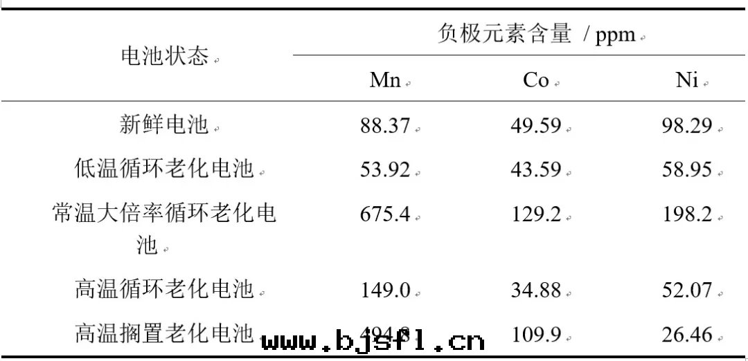 表4 老(lǎo)化(huà)電(diàn)池(SOH=80%)負极材料过(guò)渡金(jīn)屬元(yuán)素ICP-OES測試結果(guǒ)