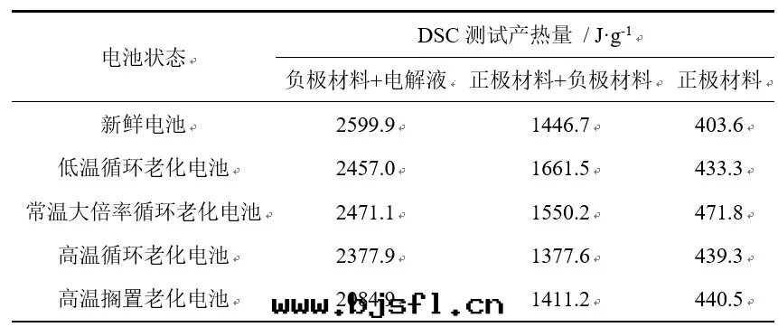 表5 老(lǎo)化(huà)電(diàn)池(SOH=80%)組份材料DSC測試結果(guǒ)