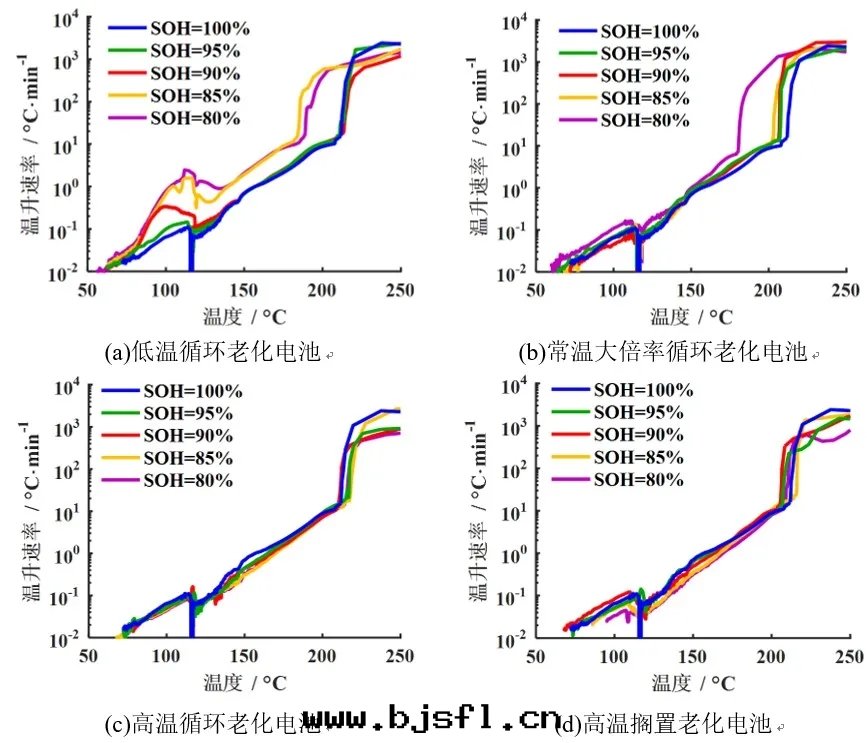 图(tú)12 不同(tóng)老(lǎo)化(huà)路(lù)徑下(xià)電(diàn)池热(rè)失控温(wēn)升(shēng)速率-温(wēn)度(dù)曲(qū)線(xiàn)随SOH的(de)变化(huà)