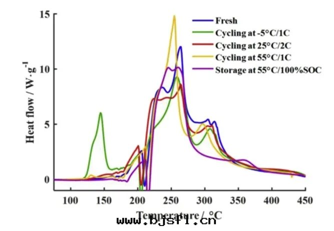 对(duì)不同(tóng)老(lǎo)化(huà)工況下(xià)衰減至(zhì)80%SOH的(de)電(diàn)池的(de)組份材料进行DSC測試,以(yǐ)探究電(diàn)池組份材料的(de)热(rè)穩定(dìng)性(xìng)变化(huà),如(rú)图(tú)10和(hé)图(tú)11所(suǒ)示。