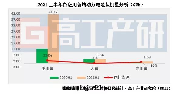 从裝(zhuāng)機(jī)量(liàng)應(yìng)用領域来(lái)看(kàn),上(shàng)半年(nián)新(xīn)能(néng)源乘用車領域裝(zhuāng)機(jī)约41.17GWh,同(tóng)比增长(cháng)234%;新(xīn)能(néng)源客車領域裝(zhuāng)機(jī)约3.54GWh,同(tóng)比下(xià)降1%;新(xīn)能(néng)源專用車領域裝(zhuāng)機(jī)约1.68GWh,同(tóng)比增长(cháng)93%。