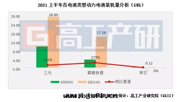 从裝(zhuāng)機(jī)量(liàng)電(diàn)池類(lèi)型来(lái)看(kàn),2021上(shàng)半年(nián)三(sān)元(yuán)動(dòng)力電(diàn)池裝(zhuāng)機(jī)量(liàng)约28.89GWh,同(tóng)比增长(cháng)141%;磷酸(suān)铁(tiě)锂動(dòng)力電(diàn)池裝(zhuāng)機(jī)量(liàng)约17.38GWh,同(tóng)比增长(cháng)273%。其(qí)中(zhōng),磷酸(suān)铁(tiě)锂動(dòng)力電(diàn)池裝(zhuāng)機(jī)量(liàng)占比由(yóu)去(qù)年(nián)上(shàng)半年(nián)占比的(de)27.8%提升(shēng)至(zhì)今年(nián)同(tóng)期37.5%。