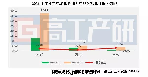 从不同(tóng)電(diàn)池形狀来(lái)看(kàn),2021上(shàng)半年(nián)方(fāng)形動(dòng)力電(diàn)池裝(zhuāng)機(jī)量(liàng)约37.55GWh,同(tóng)比增长(cháng)193%;软(ruǎn)包(bāo)動(dòng)力電(diàn)池裝(zhuāng)機(jī)量(liàng)约5.32GWh,同(tóng)比增长(cháng)78%;圆(yuán)柱(zhù)動(dòng)力電(diàn)池裝(zhuāng)機(jī)量(liàng)约3.52GWh,同(tóng)比增长(cháng)260%。
